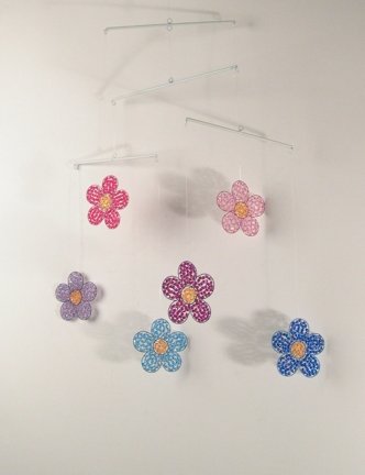 Condition: Brand NewItem SKU: SS-DB-QBA329Dimensions: H: 27 x W: 16 x L: 16 (inches)Crafted with: Polyfaced Plastic Beads, Copper WiresMore Information: Hanging mobile with 6 bright colored flowers 4" diameter each. Flowers are made of many polyfaced plastic beads knit together with copper wire. Jewel tones: purples, pinks and blues.